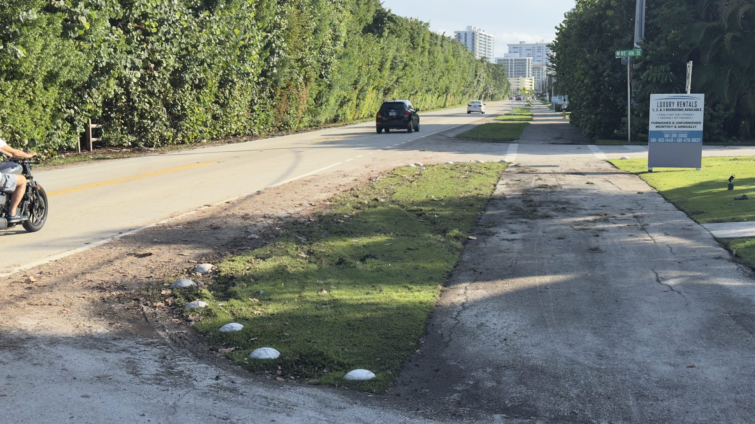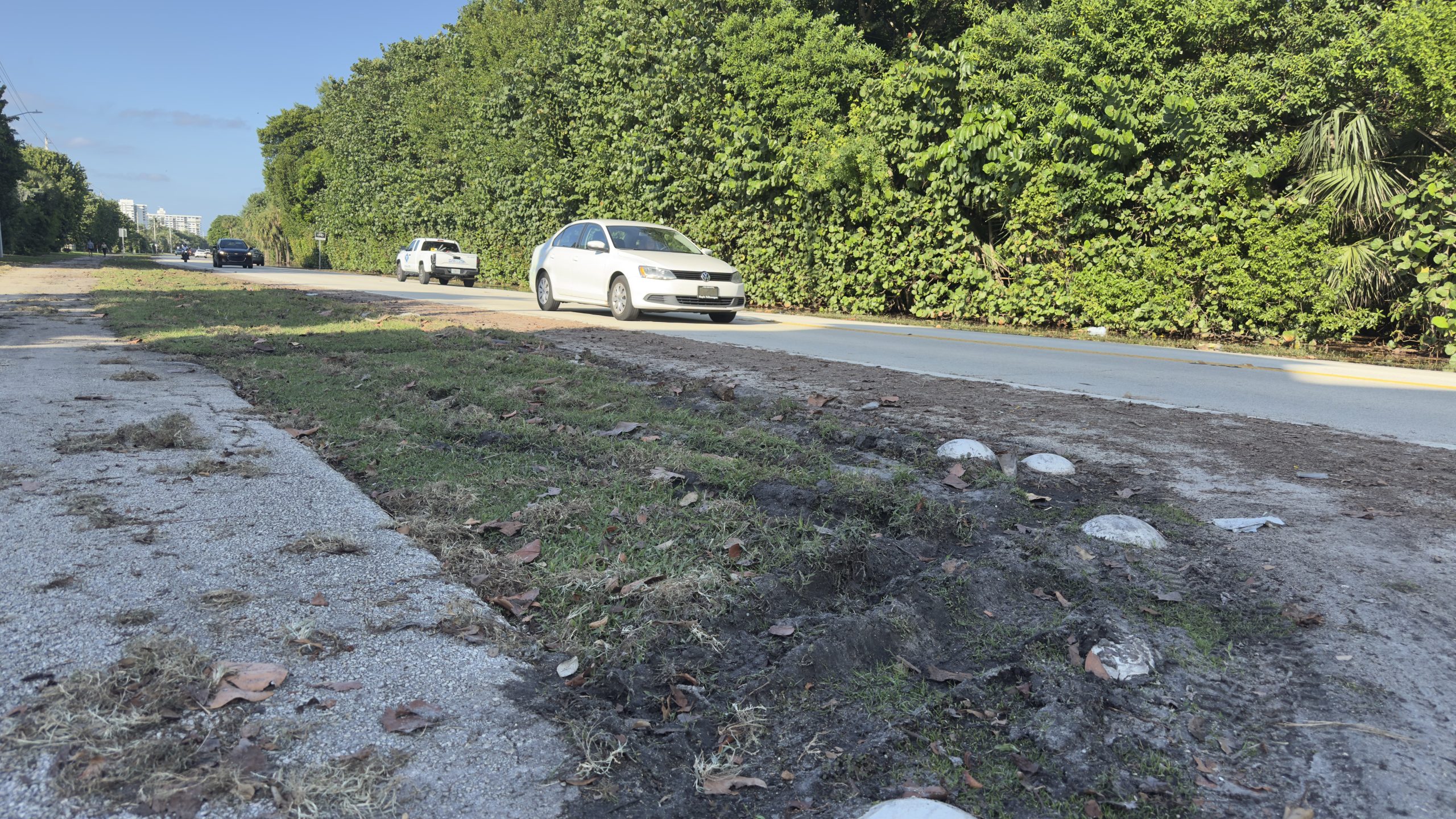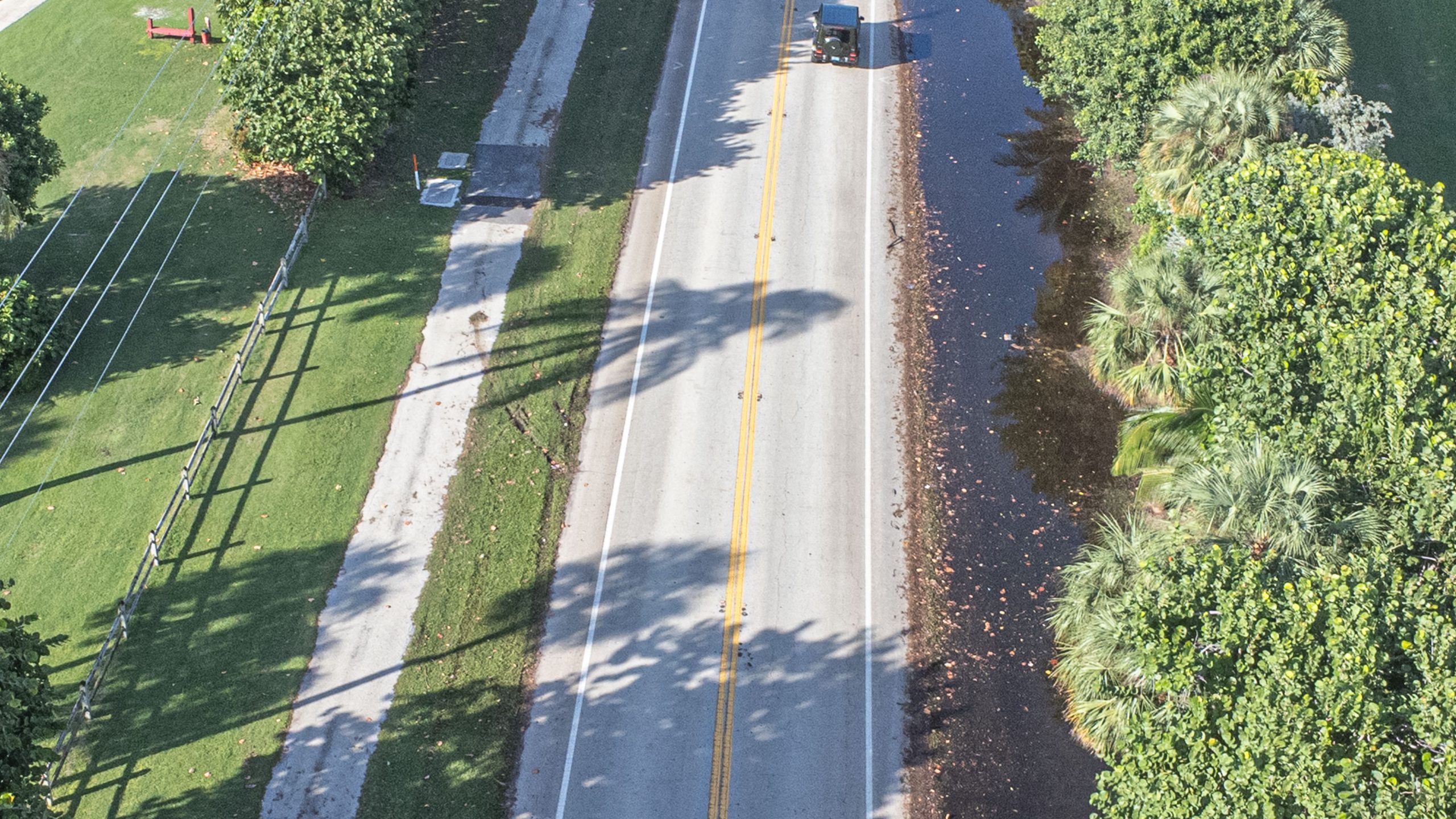The roadway itself is mostly clear, however floodwaters still occupy much of the east shoulder area. The area outside of the travel lanes includes a significant depression, leading some vehicles to occasionally become stuck or flooded if they leave the lanes or attempt to ride in the shoulder. The public works department has posted signs indicating the area may be flooded in some areas.