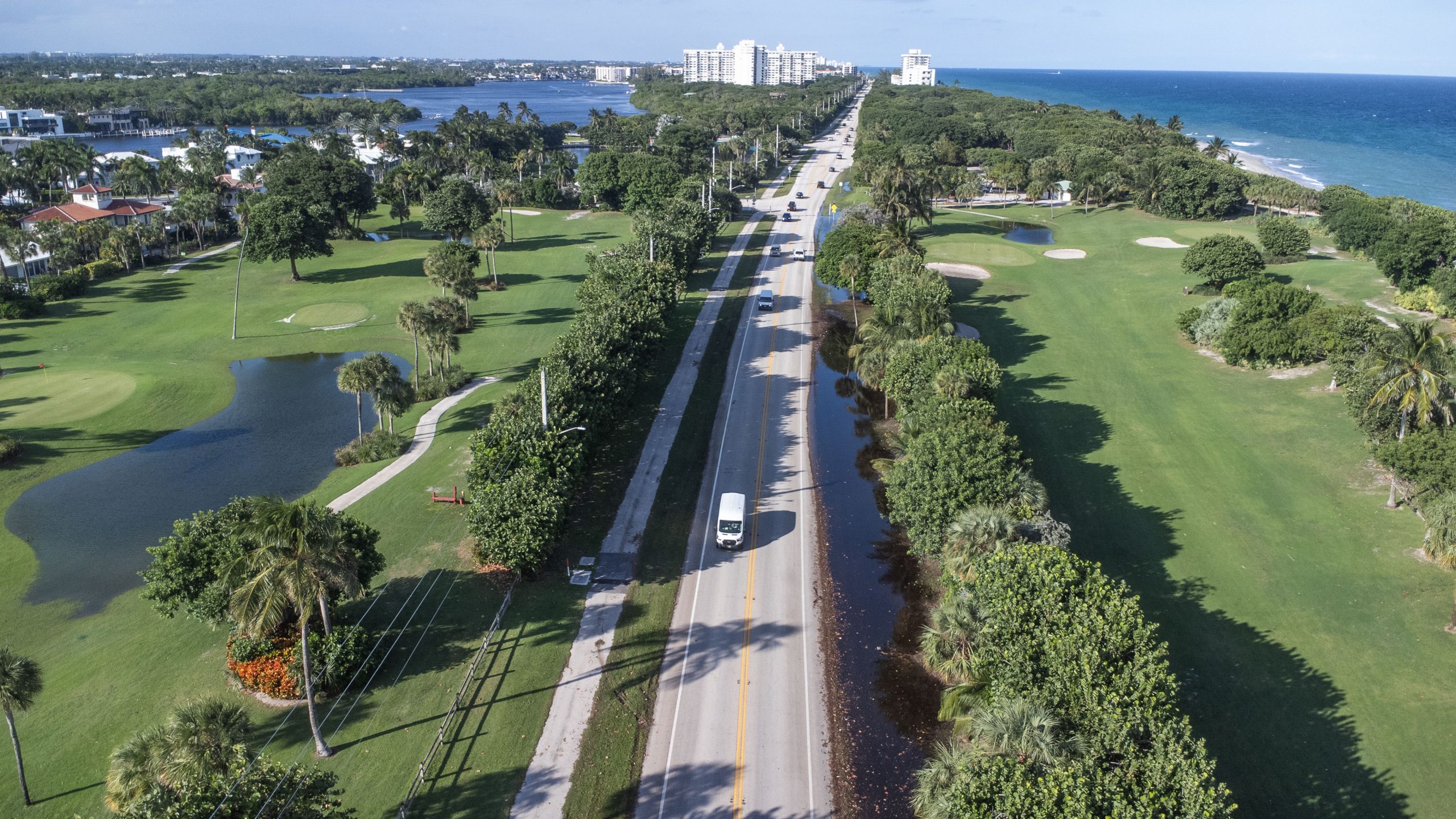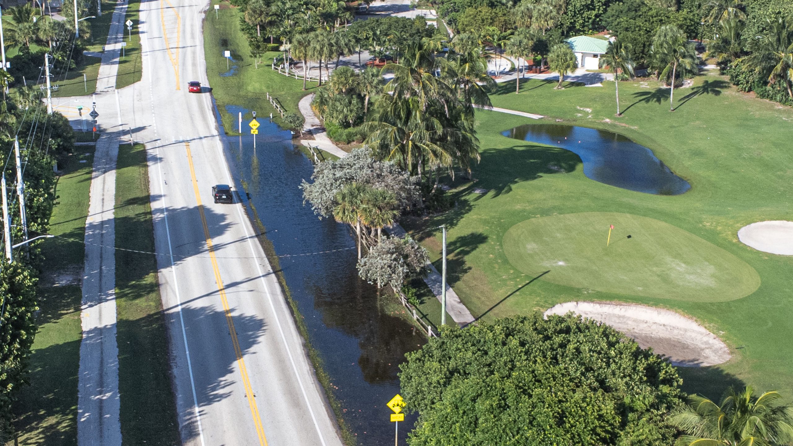 Flooding along North Ocean Boulevard (A1A) and the Alan C. Alford Red Reef Family Golf Course, Oct. 28, 2025. (Photo: Boca Daily News)