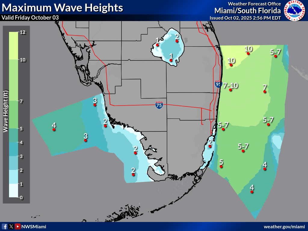 The National Weather Service office in Miami was forecasting waves heights would continue to build over the next two days, reaching 7-10 feet Friday into Saturday. Large breaking waves of 5-9 feet in the surf zone were predicted, as well as dangerous rip currents that could sweep even the most experienced swimmers out to sea.